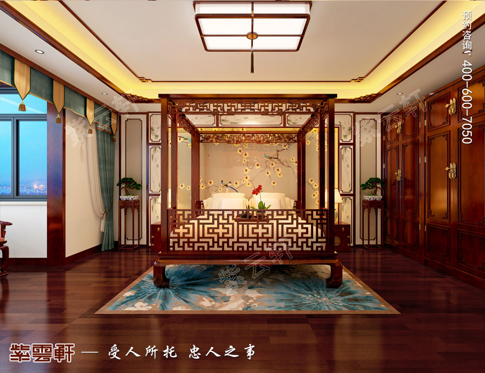 卧室,以红木为主的万字纹雕花架子床配合着精致典雅的花鸟图凸显出传统韵味。整体家具摆放陈列工整对称,极具中式协调性。红木色调带来的温馨既视感为业主提供了一处休闲惬意的休憩空间。房子中式装修在细节之处演绎古典之雅,再加之中式装饰凸显传统意境,岂是用美来可以形容的?