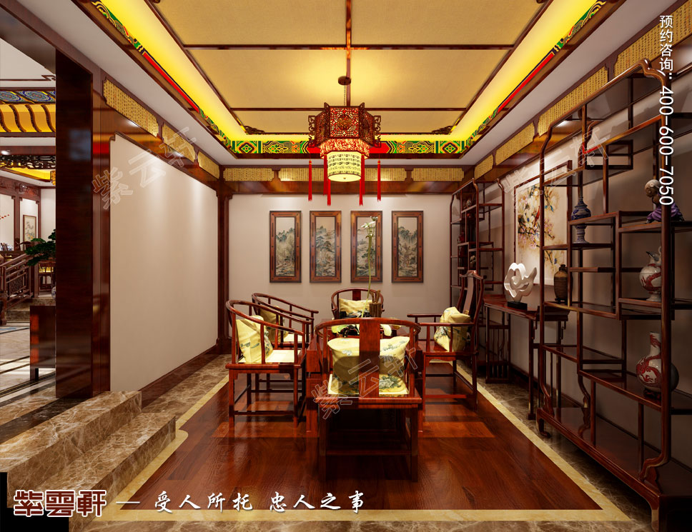 茶室,素雅圈椅组合在空间设计中承接了整体形象基调,在明黄靠枕的装点下尤显东方意蕴。对称博古架以线条流畅的造型呈现在人们眼前,珍奇古玩三三两两的装点其中,带来一丝中式美感。整体软装设计在奇石摆件与传统和中式壁画的加持下更显中式茶室的美观雅致,为品茶空间增添光彩与层次。