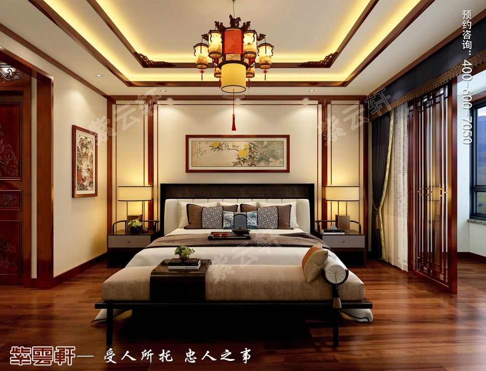 主卧,床头软包设计带来舒适之感,在深色床品的加持下整体休憩区域充满了一种深邃沉稳的既视感,对称家居的摆放颇具东方审美,空间在传统画饰的增添下更显复古协写意,中式房子装修风格将大气与典雅全部体现在卧室当中,更助于卸下一身的疲惫。