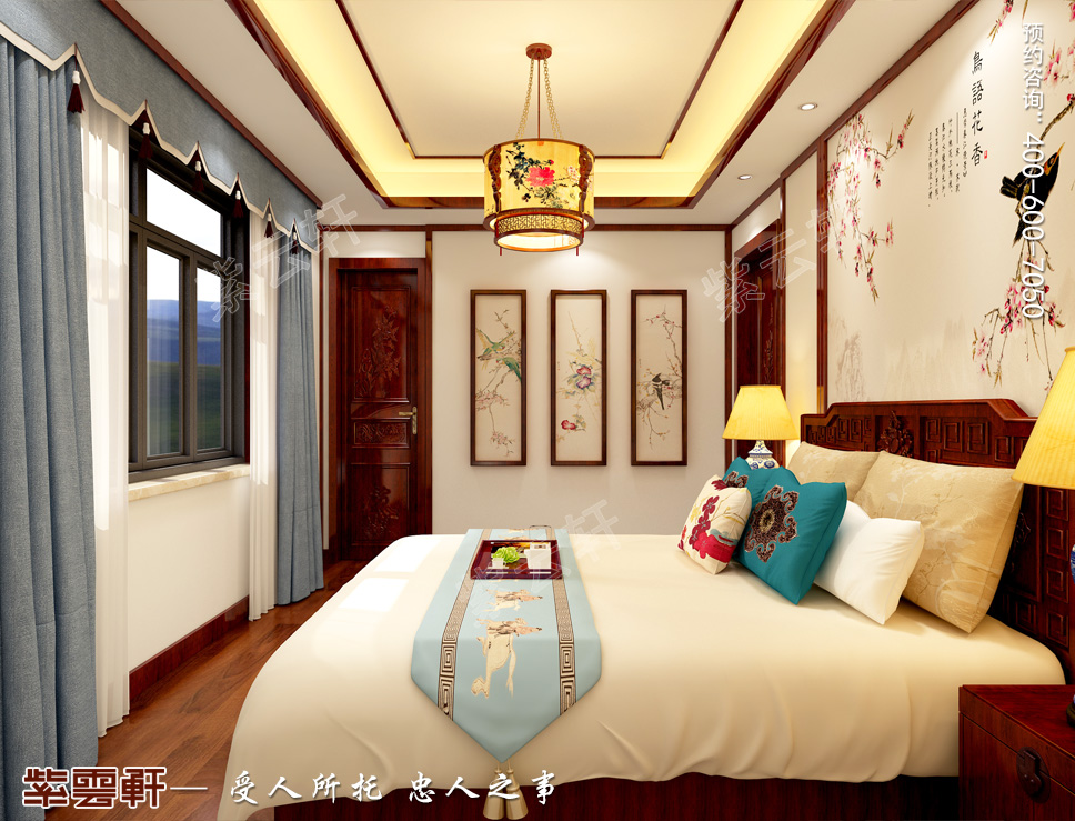 次卧,围板大床与白色床品之间形成一阵互补风格,在花鸟图背景的装饰下将整体空间风格营造出一派清雅俊逸的家庭中式装修卧室空间,红木与米色背景在视觉上给人一种传统风格,提供了一处温雅惬意的休憩空间。