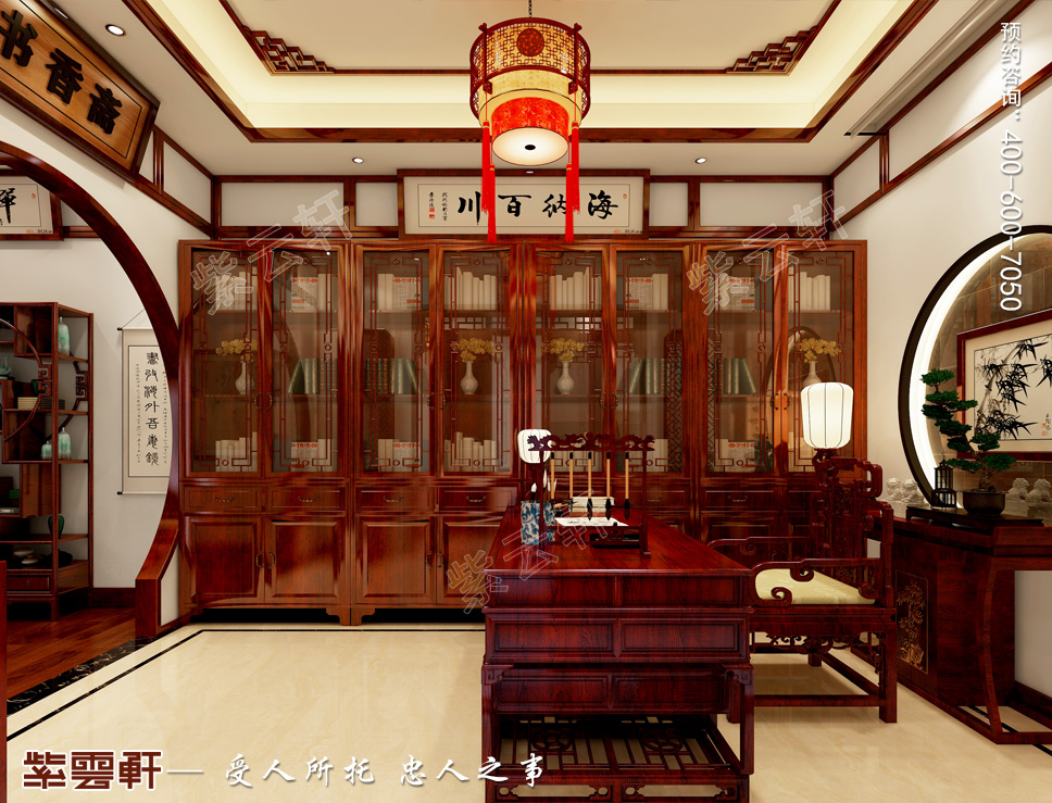 书房,穿过月洞门便来到书房,书房十分的安静雅致,整体中式家装以红木为主,将整体空间传统韵味发挥到极致,敦厚书桌组合为人们提供了办公学习之便,整排组合书柜占据了大部分空间,增强了整体空间的功能性。轩窗条案的搭配美化了书房空间装饰。