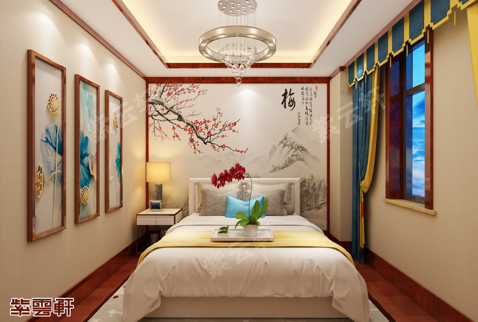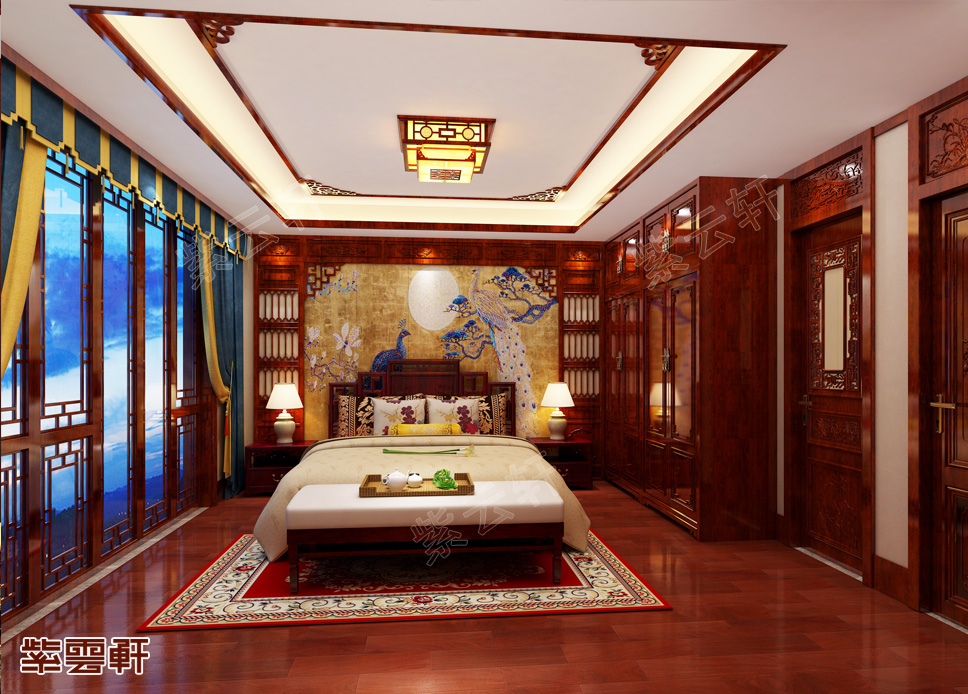 卧室,整面墙的落地窗,为卧室提供了充足的采光。中央空调设计在天花叠层内,不会破坏整体的复古主旨,别有一番味道。中式家装设计中木质地板与中式红木家具颜色统一,带有暖色色彩而温暖气质,更有家庭温馨的感觉。