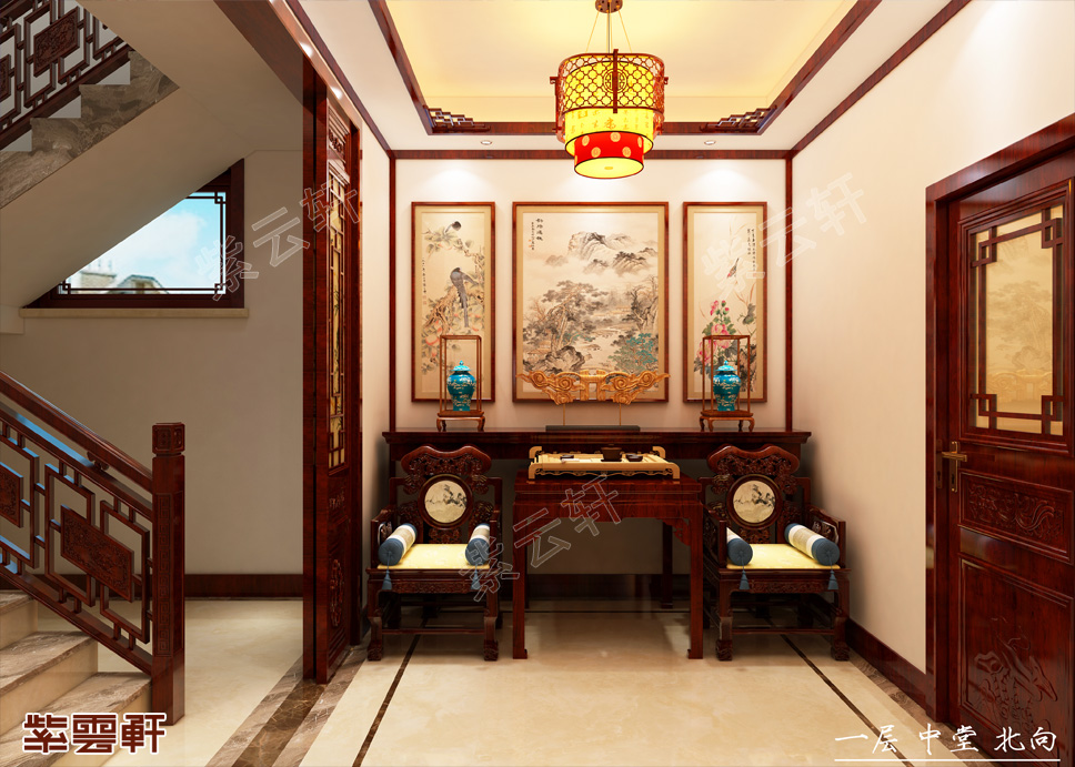中堂,进门就能看到楼梯间,设计师运用了半扇格栅门的格局,加强进门后的私密感。一侧摆放太师椅与祭祀桌,利用墙面的区域设计三套中堂画。传统的进门中堂在今天看上去非常特别,中式装修赋予了这套房子独特的空间个性。