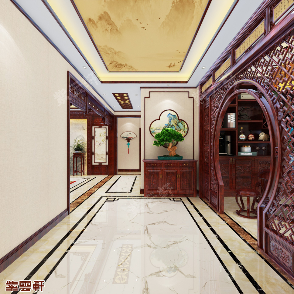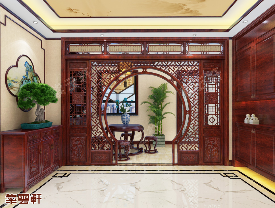 玄关,初始玄关在侧方墙面不做设计,避免过多的复杂线条拥占室内空间,造成繁杂的感觉。相比之下,在餐厅的一侧设计了一套月洞门式的垭口设计,玄关墙摆放柜子与盆景,成功的在玄关塑造出宽敞又不单调的轻巧搭配。别墅中式风格装修根据布局及面积的大小进行设计,从视觉效果上扩大了空间。