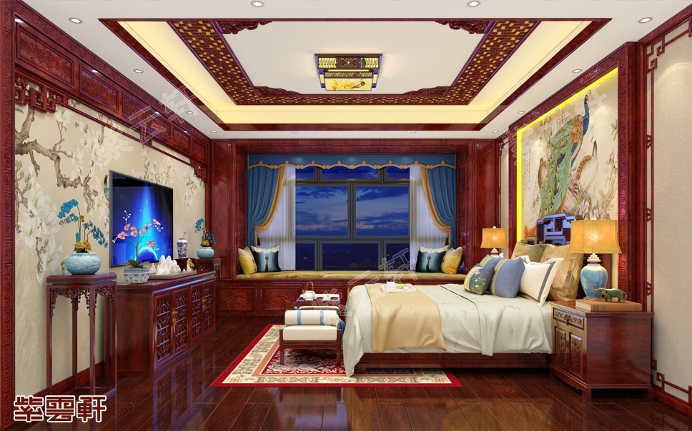 卧室,整体用调制成红木色的木材组成的卧室,尽显古典风情的柔美。背景墙和床头的描边木材装饰,带来了正宗的古典风格基调,舒心雅致又温暖。阳台处打造成暖阁榻榻米,没事的时候放上一个小矮桌,加一个海绵垫,瞬间就变成一个好用的休闲区,功能多又富有设计感。中式家庭装修设计将中式的宁静与优雅跃然纸上,让人欣喜。