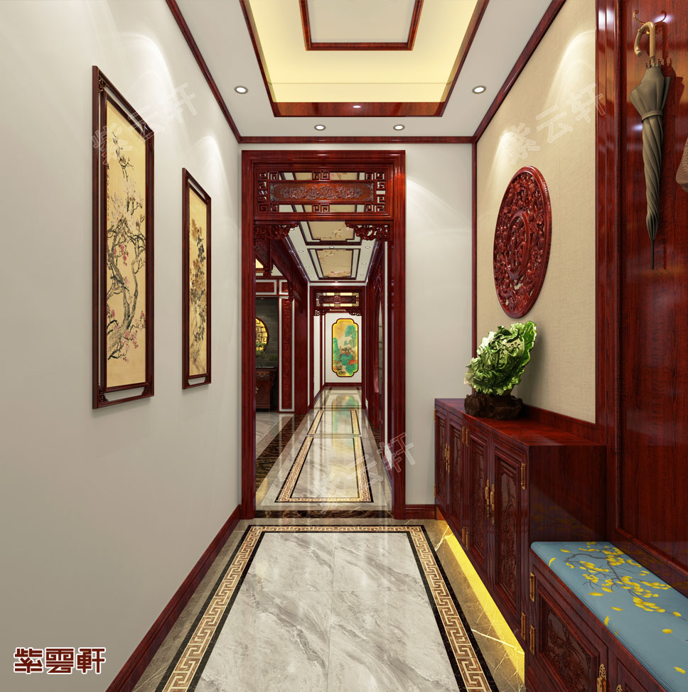 玄关,墙面通过陈列中式水墨写意画简单装饰,在白墙的底子下塑造一种简单又文雅的入户体验。换鞋柜一旁摆上一个略大的红木柜子,地下留出空间并安装隐藏灯,台面装饰一个玉器点缀。从玄关往家中望去,连贯的花格装饰形成一个绵长的景深镜头,大大增加了空间的通透感,别样的住宅装修更能给人们带来别样的体验。