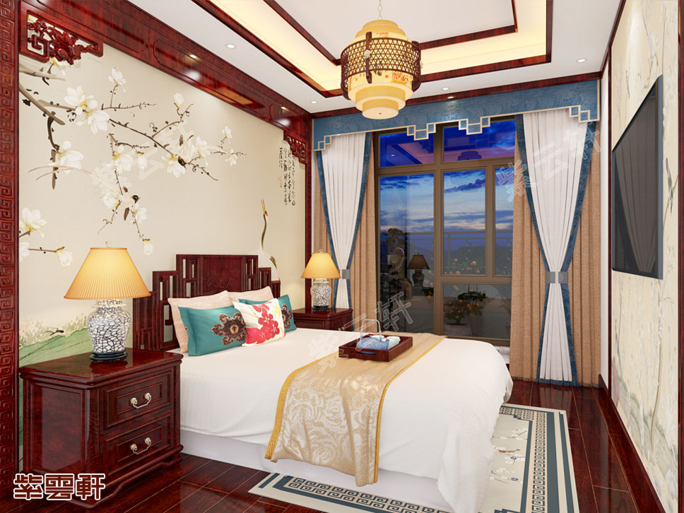 卧室,古典风格往往给人一种宁静致远的感觉,其中蕴含的中式韵味让人回味无穷,整体的装饰风格也以高雅为主,背景图中的山水图更给人一种返璞归真的感觉。尊贵的床头设计,仿古造型的宫灯,将中式设计卧室的雍容华贵呈现出来。