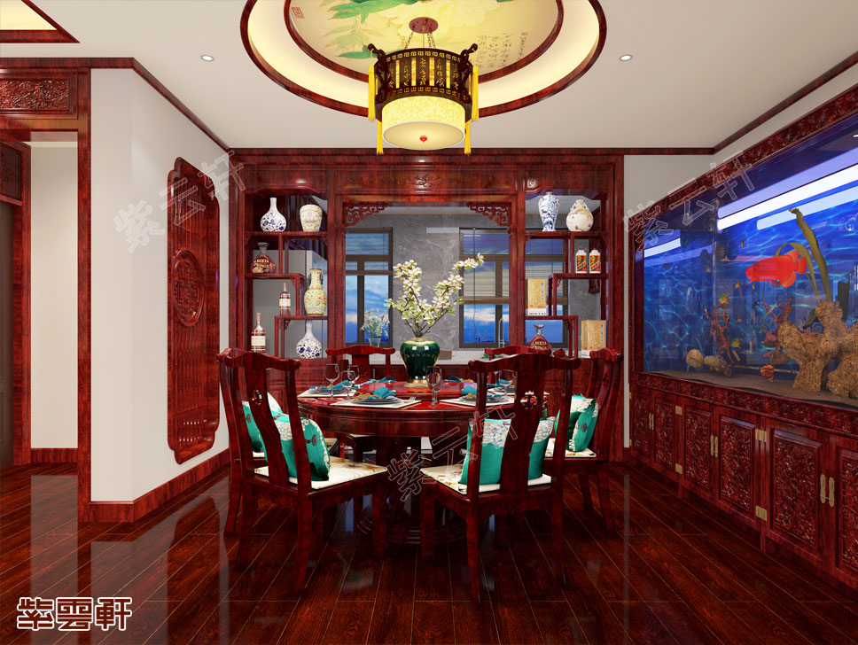 餐厅,大面积的鱼缸给餐厅带来了生机,不仅起到了美观的效果,还能增加家庭的财运,下面的柜子也选择红木,不仅起到收纳的作用,原木更接近大自然。餐厅与厨房之间用博古架进行分隔,上面不仅可以摆放瓷器,还能摆放自己收藏的美酒,美哉美哉!中式家装风格所展现出来的经典大气,最让人迷恋!