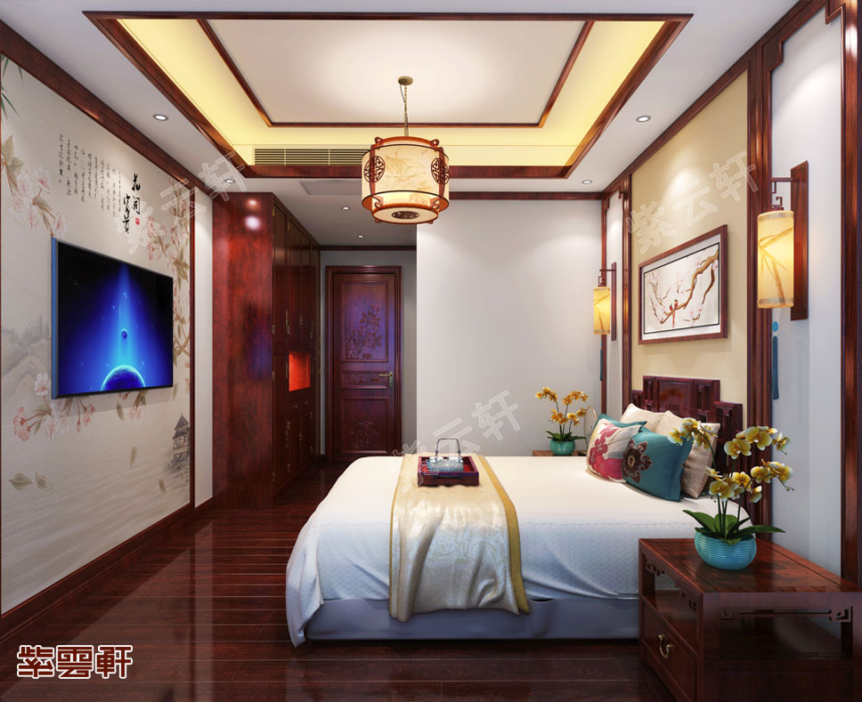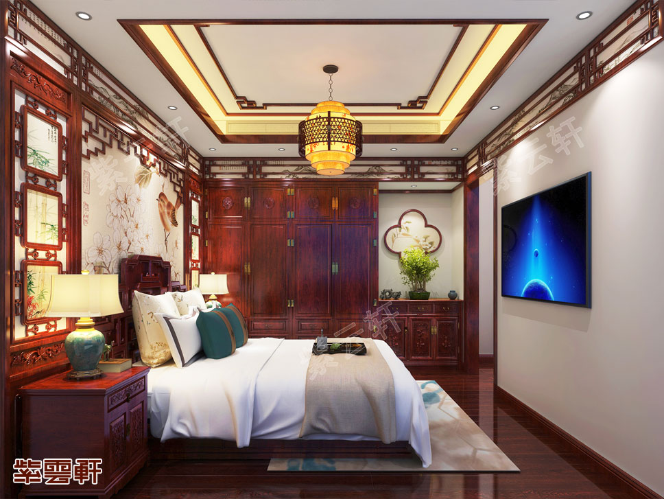 卧室,阳台做了飘窗,简单用木板保持整齐划一的木材自然美。地板就是普通的木质地板,主要线条设计在床头靠背与墙面雕刻上,这些精美的线条极具装饰性,同时没有让人感到夸张的造型,别墅装修中式设计卧室为业主打造一个舒心惬意的睡眠环境。