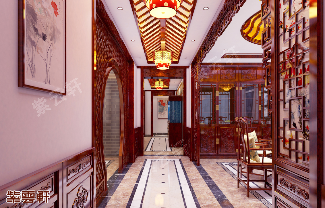 玄关,一套特殊的人字形吊顶,搭配一组灯笼,通风管道和射灯隐藏在吊顶后边,外形和光线条件都很上乘。业主心爱的鱼缸摆在走廊里,最底部的墙上安装一套中式画,光影沉淀中塑造出中式装修风格的美感。
