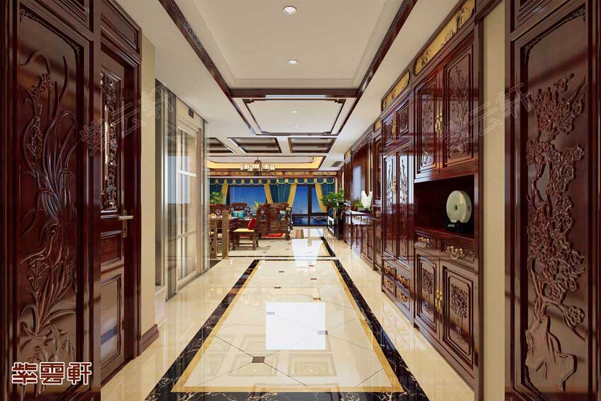 入户,古典风格在工艺上要求精工细作,对材质的要求很苛刻。比如图片中这些带有油性的红木材质,表层光滑明亮,让人一眼就能感受到这套设计的价值之高。柜体选择硬朗的直线条,细节处则加入多样的手工雕刻,勾勒出纯净的中式空间,让人忍不住抚摸一下,感觉中式别墅的高贵。