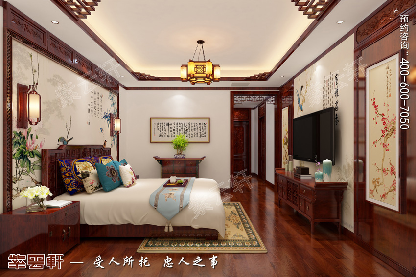 主卧,红木家具与浅色背景基调之间相互融合,提升了整体空间意境,在硬装实木大床与白色床品的搭配下丰富空间质感,传统花鸟图的背景壁画将中式艺术表达的淋漓尽致。中式家庭装修以红木家具与传统书画装点,美化了中式卧室整体,为人们营造出文雅又舒适的居室空间。