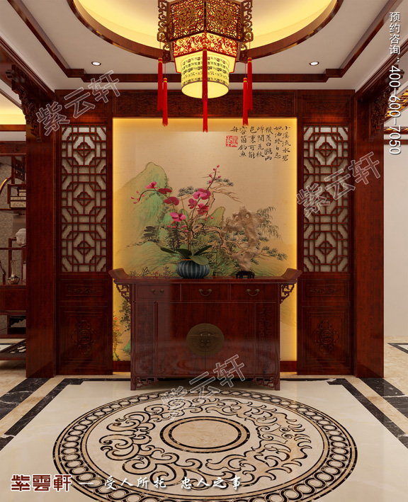 门厅,作为整体居室的过渡空间,玄关处以传统山水画影壁作为主题,再与插花盆栽相互呼应,形成了一处景观独到的装饰空间,同时也奠定了整体中式家具的基本风格。中式室内设计简约中又流露着规整布局的家装空间,让人忍不住想要进去参观一下。