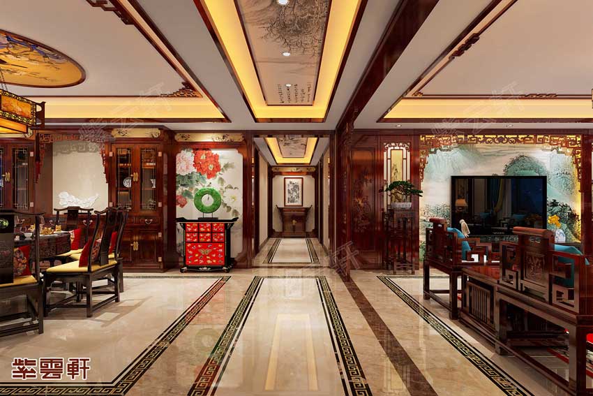 入户,一套常见左右分布的户型,中间用地板的花纹与天花板的图画做两组造型,形成一个比较独立的区域。走廊内加入一个柜子与墙面画装饰,进一步增添艺术气息,中式风格装修营造出宁静、高端的氛围。