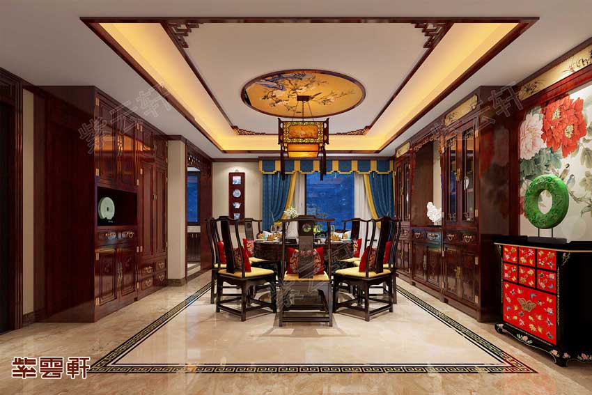 餐厅,玉石、书画等中式装饰,将高度凝练中式细节融入空间内部,拉高整个家装的文化内涵。餐厅空间很大,足够摆放两套中式橱柜,不仅增加了房屋的储物功能,还满足了墙面的装饰效果。住宅装修中的餐厅是业主着重要求的,一家人一起享受一日三餐,更需要一份感动与美好。