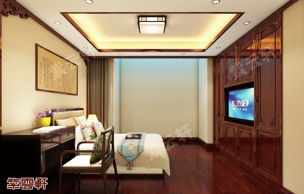 卧室,整套红木家具搭配米色四件事,床头背景上选用一幅中式背景图,整体上给人一种和谐自然的感觉,简约设计之中同样能给人视觉享受。别墅装修卧室以仿古宫灯做点缀,古典优雅中又不失现代时尚,清爽的视觉效果带来唯美的生活享受。