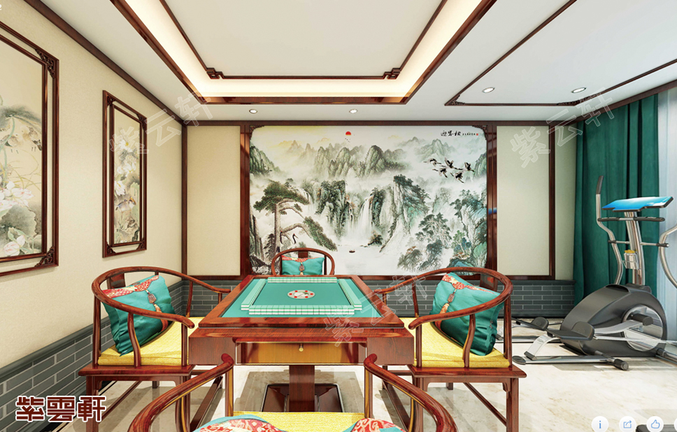 休闲区,将棋牌室与运动区进行融合,以木质格栅与中式背景图凸显出古典韵味与中式格调,红木圈椅与红木棋牌桌更显奢华与高级,吊顶处暗藏灯带的设计,让整个居室更加的精致,一种细水流长的感觉油然而生,中式设计在无意间传承着优雅高贵。