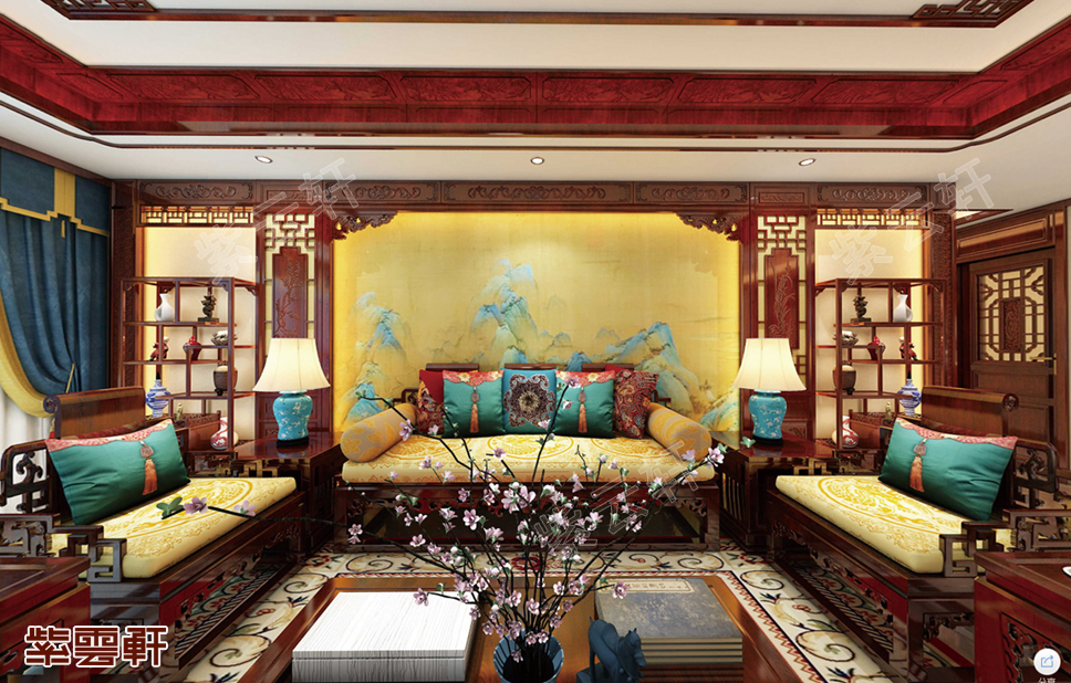 客厅,中式客厅通过红木家具、古典装饰、中式元素壁画等进行跨时间展现,是可以触达到人们内心的传统文化内涵,特别是将明清元素与现代元素进行交融,让人身临其境的感觉东方境界的端庄丰华。中式别墅设计中的背景墙以青山为主,更显示了环保的号召,给我们一个环保的家居。