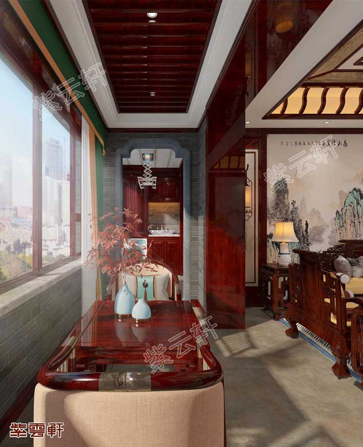 阳台,贴上灰砖样式的壁纸,塑造出与客厅截然不同的色彩,并保留中式装修的复古韵味。天花板上用木格做了一层装饰,晚上在借助客厅的主光源的时候,增加一份不同的光线效果。茶桌和座椅都是木质的,从色系上形成统一。