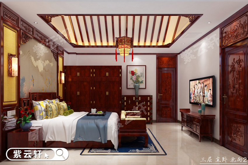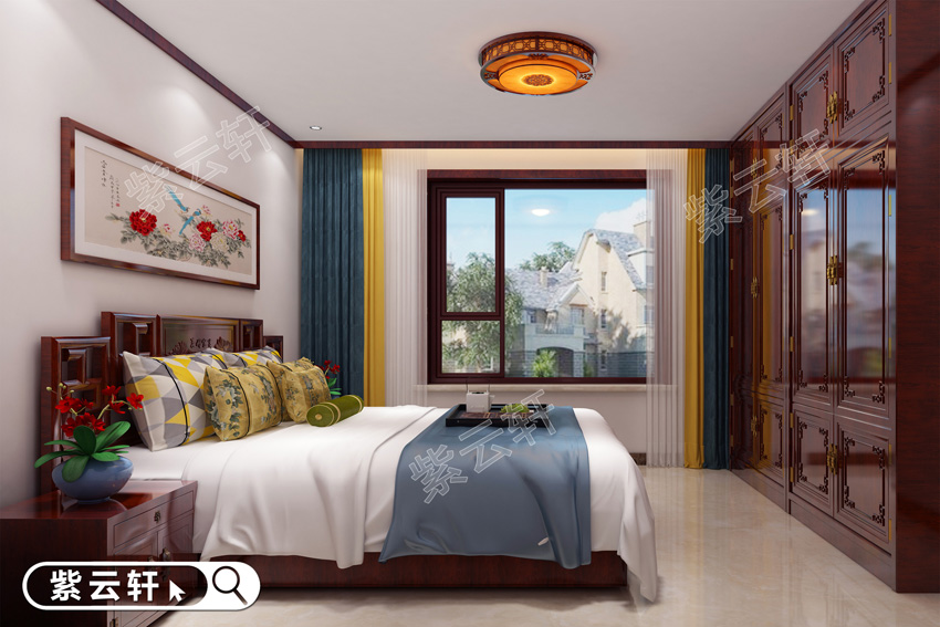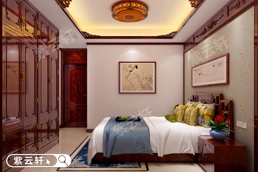 卧室,丰富的红木硬装软装布满整个卧室,雕刻精美纯粹,纹理清晰自然,色彩饱满有光泽,丝毫看不到一丝俗气,营造出令人心神安宁的睡眠氛围,同时完全体现出主人的品味和高端身份。别墅中式装修设计以盆栽来进行装饰,更能展现温馨自然的家居氛围,喜欢古典风格的还可以用一些仿古装饰品,这样的室内空间想想就非常舒心。