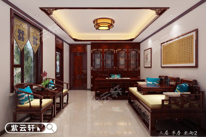 书房,阅读区以书桌书柜组合排在墙边,占用面积虽不大但中式感却非常强烈。罗汉床与太师椅为书房提供接待区域,大气优雅,内敛醇厚。墙面分别装饰书法与画作,干净富又有质感。别墅室内装潢更要注重灯具的选择,特别是书房,不仅要注意采光,还要保证灯光的光线充足。